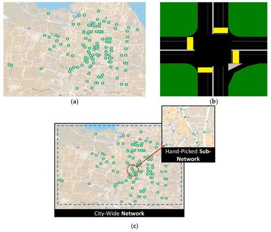 Maps of 115 intersections equipped with working vehicle detectors located in the urban network of Surabaya, Indonesia. Every traffic light symbol in (a) represents one intersection. Every intersection usually consists of 3–4 vehicle detectors. The placement of vehicle detectors in an intersection is shown in (b), where each yellow square represents one vehicle detector that counts vehicles leaving an intersection. Part (c) compares the city-wide network (blue dashed area) with the hand-picked sub-network (red dashed area).