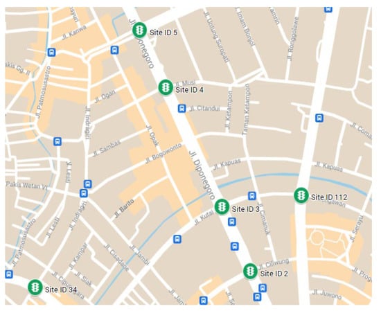 The Diponegoro neighborhood is a corridor that spans around 2.7 km, and roads on which detectors lie are categorized as primary arterial roads []. If these detectors are grouped in a sub-network, there are four intersections labeled as Site ID 2, Site ID 3, Site ID 4, and Site ID 5 as shown in Figure 5. Vehicle detectors located at Site ID 34 and Site ID 112 are not considered in this case study, as vehicle detectors in both intersections are located in the link with a different road class, secondary arterial road class and secondary collector road class, respectively.