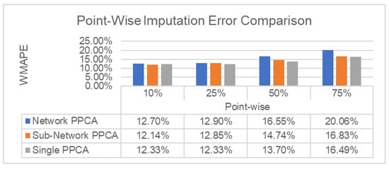 Imputation performance comparison for Network PPCA, Sub-Network PPCA, and Single PPCA for Scenario A with different point-wise missing data ratios.