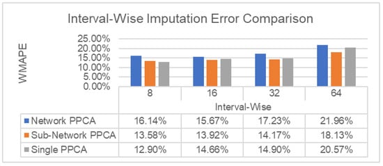 Imputation performance comparison for Network PPCA, Sub-Network PPCA, and Single PPCA for Scenario A with different interval-wise missing data intervals.