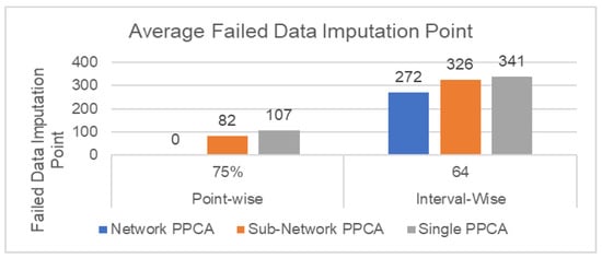 Average failed data imputation points for Network PPCA, Sub-Network PPCA, and Single PPCA for Scenario A with 75% ratio of point-wise missing data and 64 intervals of interval-wise missing data.