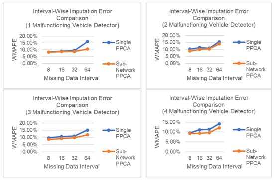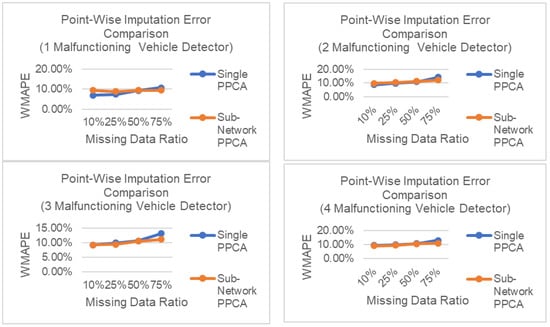In the more realistic case where only some vehicle detectors suffer missing data problems, Sub-Network PPCA resulted in better performance for all types of missing data compared to Single PPCA, exploiting the information derived from healthy neighboring vehicle detectors. The neighboring healthy vehicle detectors in Sub-Network PPCA also helped to impute all missing data without failure in extreme cases of missing data, up to 75% point-wise missing data and 64 time-intervals of missing data.