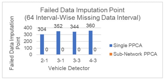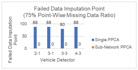 For Scenario B, Figure 9 shows the performance of both methods tested against point-wise missing data for different numbers of malfunctioning detectors. In general, the performance between both methods is close, which is a similar result as in Scenario A Sub-Network PPCA indicates less influence by the missing data ratio, compared to Single PPCA from the steepness of the plot. One other important point is that Sub-Network PPCA successfully imputes all missing data, even when the missing data ratio is 75% as shown in Figure 10. Sub-Network PPCA is able to achieve this because the method can impute missing data from other healthy detectors, while in Single PPCA, each detector can only rely on its own historical data, resulting in around 80–88 failed data imputation points for each malfunctioning detector.