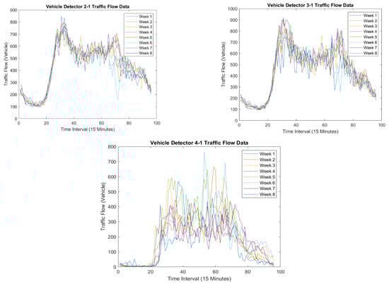 where each column represents data points from a single detector. The resulting matrix of observed data has dimensions , where denotes the number of consecutive days of traffic flow data on vehicle detectors in the network. Figure 1 illustrates the construction of the matrix in Equation (4).