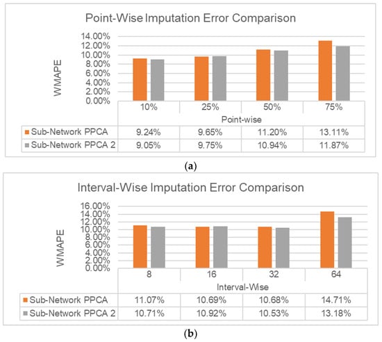 Imputation error comparison between Sub-Network PPCA and Sub-Network PPCA 2 for (a) point-wise missing data and (b) interval-wise missing data.