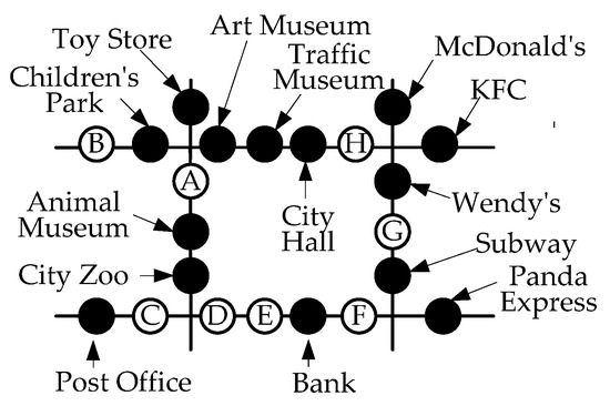 Many studies have applied big data to commercial applications, including helping real estate agents find suitable residential areas for customers [1] and helping companies estimate the number of customers a product may attract based on its characteristics [2]. These applications are enabled by continuous evolution in hardware and computing performance, which allows users to store and compute diverse and massive amounts of spatial and temporal information, such as the locations of the street intersections in a city, the distances between intersections, and the visit records of users. This study discusses a means of utilizing this information to help businesses find suitable locations for new stores. This problem is well-considered in the literature [3,4,5,6]. For example, consider the road network presented in Figure 1, where solid points indicate existing stores and hollow points indicate candidate locations. If user U wants to open a new family restaurant, the target algorithm can assist U to find the best location. The algorithm suggests location A, which is in the middle of a group of family attractions and is far away from other well-known family restaurants. For convenience, existing attractions and stores are referred to as ‘points of interest’ (POIs).
