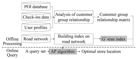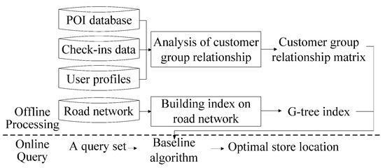 As shown in Figure 2, the system framework used in this study includes two stages: offline processing and online query. Offline processing starts by analyzing the similarities among the customer groups of various POIs to convert them into customer similarity scores. These scores are stored in a matrix to set the influence score of the POIs in the second stage. The G-tree index is then established to swiftly calculate the road distance between two points in the second stage. After the query set Q = {pP, nP, rP} is input by the user, the second stage is initialized to identify the optimal store location for Q.