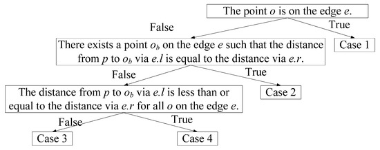 Consider POI p and point o, which is any given point on edge e. The shortest distance between p and o, dist(p, o), can be one of four cases depending on three conditions, as shown in Figure 3: (1) Is o on e? (2) Is e at a certain point ob so that the path length from p to ob via e.l equals the path length from p to ob via e.r (i.e., ∃o∈e, dist(p,e.l) + dist(e.l,o) = dist(p,e.r) + dist(e.r,o))? (3) Do all points o on e cause the path length from p to o via e.l to be less than or equal to the path length from p to o via e.r (i.e., ∀o∈e, dist(p,e.l) + dist(e.l,o) ≤ dist(p,e.r) + dist(e.r,o))?