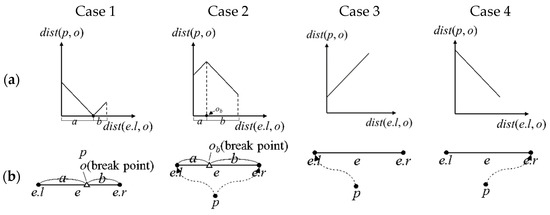 The graphs of dist(p,o) for each of these cases are as shown in Figure 4a, where the x axis represents the shortest distance dist(e.l,o) from the left vertex of e to o, and the y axis represents dist(p,o). The corresponding road diagrams are displayed in Figure 4b, where the dotted line is the shortest path from p to o. When o is on e, dist(p,o) represents Case 1, which is a piecewise linear function where dist(p,o) equals 0 when o is p. We refer to o as being p on a break point on e. When o is not on e, dist(p,o) = min(dist(p,e.l) + dist(e.l,o), dist(p,e.r) + dist(e.r,o)), and the possible conditions are Cases 2, 3, and 4. If a certain point ob can be found on e so that dist(p,e.l) + dist(e.l,ob) = dist(p,e.r) + dist(e.r,ob), dist(p,o) represents Case 2, which is a piecewise linear function. We refer to ob as being p on a break point on e. If a certain point o can be found on e, dist(p,e.l) + dist(e.l,o) ≤ dist(p,e.r) + dist(e.r,o), dist(p,o) represents Case 3, which is a linear function. Otherwise, dist(p,o) represents Case 4, which is also a linear function. Thus, dist(p,o) is either a linear function or a piecewise linear function.