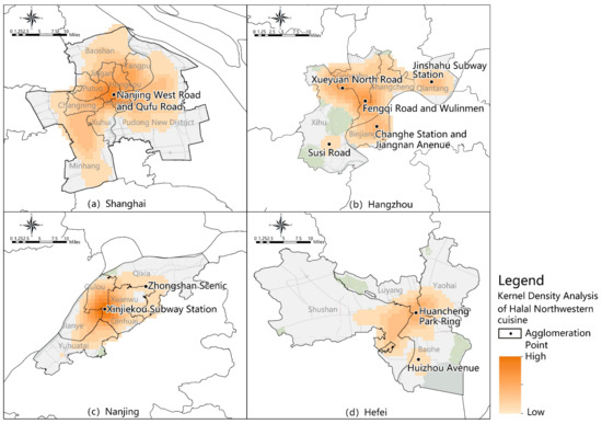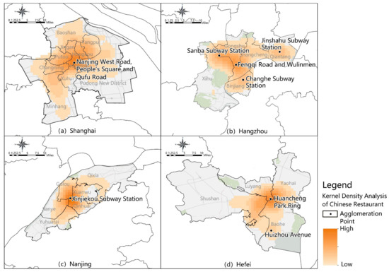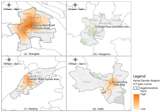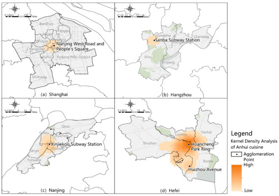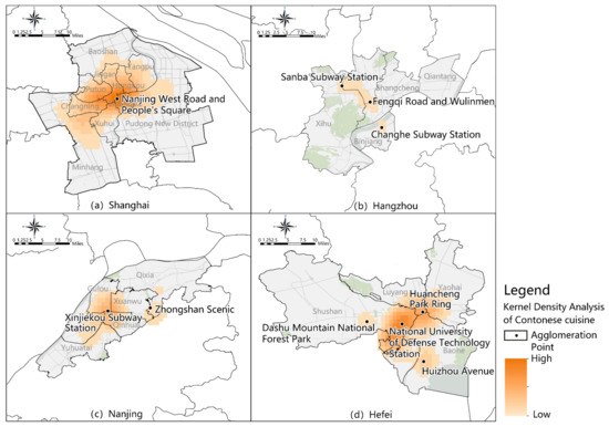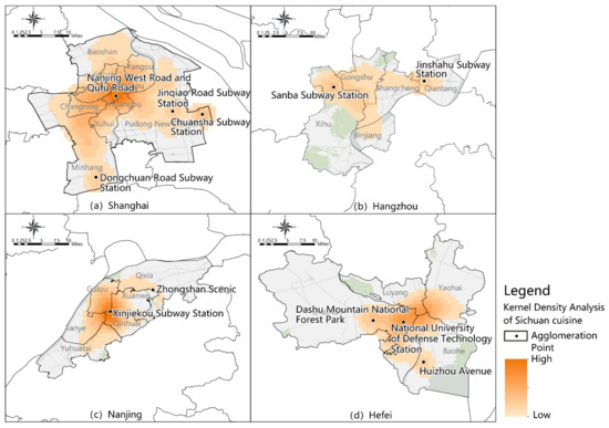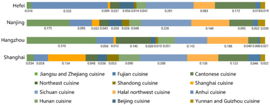 - From the perspective of the catering space pattern of different cuisines, it can be divided into five types. In the first type, the main agglomeration areas are formed in the local origin area of the cuisine and other cities form weak agglomeration points. In the second type, the main agglomeration area is mainly Shanghai, supplemented by Nanjing and Hefei, and Hangzhou is the secondary agglomeration area. In the third type, Shanghai forms the main agglomeration area, Nanjing and Hefei form the secondary agglomeration areas, and Hangzhou has no obvious agglomeration point. In the fourth type, the agglomeration degree in Shanghai, Nanjing, and Hefei is not much different, but in Hangzhou is relatively weak. In the fifth type, the agglomeration degree is relatively high in the four cities, and the agglomeration range is wide and there are many agglomeration points. However, only Shanghai cuisine, Jiangsu and Zhejiang cuisine, Anhui cuisine, Fujian cuisine, Shandong cuisine, and Hunan cuisine have a significant positive correlation in space, and they weaken in turn.