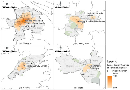 - From the perspective of the overall characteristics of the catering industry, the number of Chinese restaurants is much larger than that of foreign restaurants. Shanghai and Nanjing have the highest concentration of Chinese restaurants, while Hangzhou and Hefei have formed multiple clusters. The central cities of the YRD have formed core centers of different density levels. The high-density areas of the various cities also show the characteristics of partial spatial overlap.