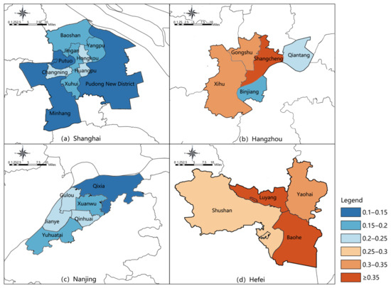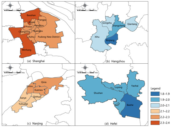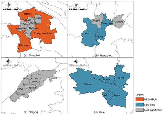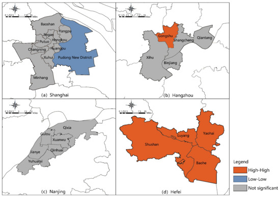 - From the perspective of the catering industry development index, the local characteristics of cuisines in Hangzhou and Hefei are more prominent, and the composition of cuisines in Shanghai and Nanjing is more balanced. Shangcheng District of Hangzhou, Luyang District, and Baohe District of Hefei have the highest CLI. The CLI of all administrative districts in Shanghai and Nanjing is low. Shanghai’s Minhang District and Baoshan District have the highest CDI. The Binjiang District of Hangzhou and Baohe District of Hefei have the lowest CDI. The overall and individual catering industry in the central cities of the YRD have a significant positive correlation in space, showing a trend of convergence. The YRD prefers Sichuan cuisine and Halal Northwestern cuisine. However, Fujian cuisine, Shandong cuisine, and Yunnan and Guizhou cuisine are relatively scarce.
