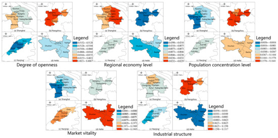 - From the perspective of the influencing factors of the catering industry, the impact strengths of the five influencing factors on CLI and CDI are roughly the same, and the order is the degree of openness, regional economic level, market vitality, population concentration level, industrial structure. The degree of openness and regional economic level are the main factors that restrict the development of CLI, and they are the main factors that inhibit and promote CDI, respectively. The geographical environment is the main factor affecting CGPI. The regional economy and population density significantly affect the cities’ high agglomeration points of catering.
