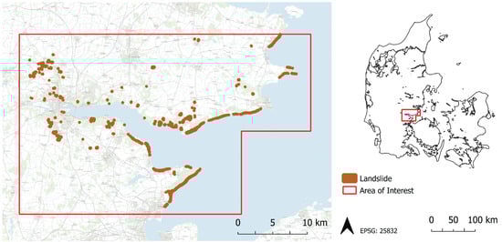 The chosen area of interest (AOI), shown in Figure 1, is located in the eastern part of Jutland, Denmark, between Horsens and Kolding, and is 972 km, containing 453 historical landslides, covering an area of 3.33 km in total. The area of interest was chosen due to the high concentration of landslides, where three different types of landslides are represented: slides (394), flows (31), and spreads (28). This includes 189 inland landslides and 264 coastal landslides, depending on their distance from the coast, where the inland landslides are defined as being farther than 300 m away from the coast. The area of the individual landslides varies between 96 m for the smallest and 73,429 m for the largest.