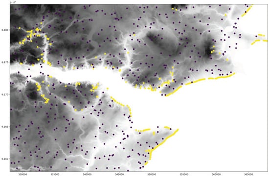Overview of the centroid points of landslides (yellow) and an equivalent amount of randomly sampled non-landslide points (purple).