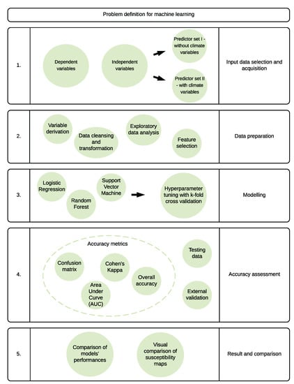 The methodological framework for this study is shown in Figure 3 and includes several steps starting with the definition of the problem for machine learning as a binary classification problem (landslide/non-landslide), followed by data selection and acquisition, and the preparation of the variables. Then, the machine learning models are set up, assessed, and validated. The models and the final susceptibility maps are compared, and the map for the future landslide susceptibility is produced.