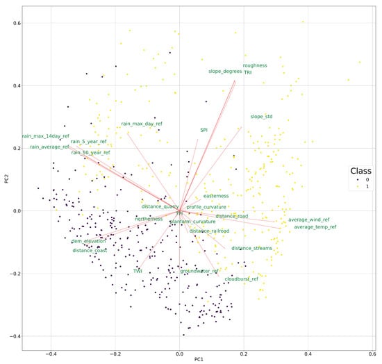 PCA biplot with principal component loadings of variables, where class 0 indicates non-landslide samples, while class 1 is landslides.