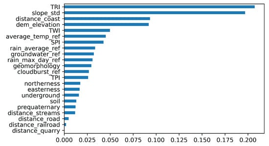 To determine the importance of the variables, the random forest model was used, as it is fairly simple and has a feature importance function [77]. From the RF feature importance, seen in Figure 6, it is noted that distance_quarry has no importance for the model, while distance_railroad and distance_road have a minor impact on the model. On this basis, they were regarded as insignificant for the prediction model and were removed. The variables that were the most important were TRI, the standard deviation of slope, distance from the coast, elevation, TWI, and SPI, which are mainly derivatives of the DEM.