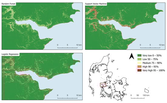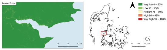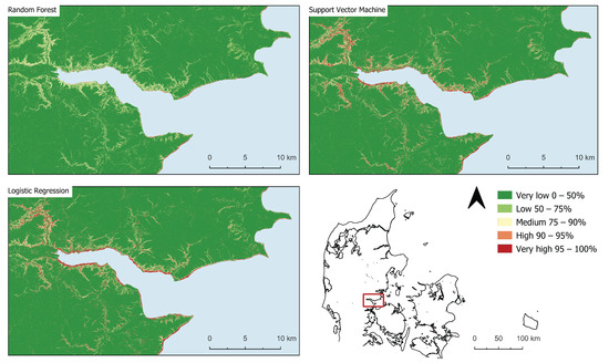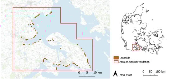 The data, the code, and the maps of the used variables supporting the reported results are available at the online repository https://github.com/angelinkatula/Landslide-susceptibility-mapping (accessed on 17 April 2022). The national landslide inventory is publicly available from https://doi.org/10.6084/m9.figshare.16965439.v1 (accessed on 20 December 2021). The DEM, vector datasets with streams, coastline, roads, railroads, quarries, as well as depth to groundwater are available for download free of charge from https://dataforsyningen.dk/data (accessed on 5 January 2022). The geological data can be downloaded freely from https://frisbee.geus.dk/geuswebshop/ (accessed on 5 January 2022) after user registration or can be viewed through a web-GIS portal https://data.geus.dk/geusmap/ (accessed on 18 January 2022). The climate data, v2020b, are available at https://www.dmi.dk/klima-atlas/data-og-rapporter-klimaatlas/ (accessed on 10 January 2022) in the form of NetCDF-files.