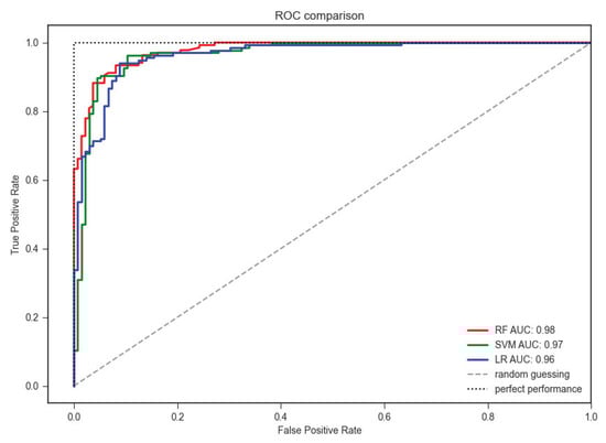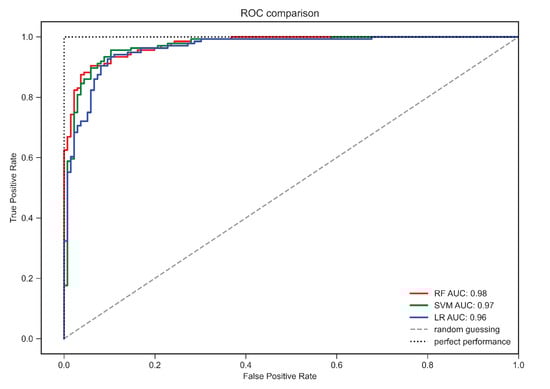 The ROC curve measures the performance of classification problems at different threshold settings. The ROC is a probability curve for binary classification problems, and the AUC indicates how well a model can distinguish between classes. The higher the AUC value, the better the model is at predicting the correct classes [83]. In this study, the ROC and AUC were used to compare the performance of the classification algorithms. The ROC curve is plotted with the true positive rate (TPR) against the false positive rate (FPR), where the TPR is on the x-axis and the FPR is on the y-axis. The TPR, also called sensitivity, corresponds to the proportion of positive samples that are correctly classified as positives (true positives) in relation to all actual positives (true positives and false negatives) [83]: