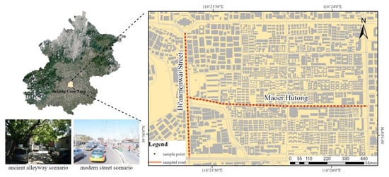 During the study on the Beijing Core Area, we discovered that the whole area could be divided into three categories: modern street, modern residential, and ancient alleyway, respectively. As one of the oldest residential blocks and the most famous attraction in the Beijing Core Area, South Luogu Lane contains multiple historical alleyways (e.g., Maoer Hutong) and is surrounded by modern avenues (e.g., Di’anmenwai Street). Therefore, Di’anmenwai Street and Mouer Hutong were selected as the study areas to cover the main scenery shown in the core area. The details are shown in Figure 1 below.