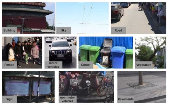Thanks to the effectiveness of semantic segmentation, several researchers have attempted to extract landscape features in street view images. Gong et al. [12,13] extracted three typical landscape features (i.e., vegetation, building, and sky) from Google Street View data using PSPNet [29], and used them to calculate the tree view factor (TVF), building view factor (BVF), and sky view factor (SVF) in the downtown of Hongkong. Middel et al. [30] extracted six landscape features from Google Street View data to derive street-level morphology and urban feature composition, as experienced by a pedestrian. Ye et al. [31] extracted multiple urban landscape features using SegNet [21] from Baidu Street View data of central Shanghai, to estimate the visual quality of urban streets. Suel et al. [32] proposed a novel deep learning based multimodal framework to jointly utilize satellite and street-level images for measuring income, overcrowding, and environmental deprivation in urban areas. Recently, Zhang et al. [33] proposed TBMask R-CNN, to extract Chinese traditional-style buildings within the Fifth Ring Road of Beijing from Tencent Street View data and quantify pedestrians’ visual perceptions of the traditional buildings. However, information on the historic districts of China is rare or nonexistent in previous datasets, making it impossible to extract historical landscape features. In addition, the existing semantic-segmentation-based methods suffer from the high variety of semantically complex contents in the historic districts, due to the high flow of people and traffic, narrow alleyways, numerous details, and the changeable lighting conditions.