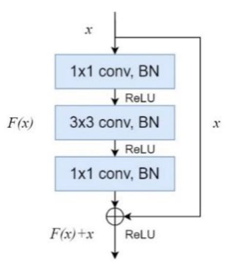 To increase the depth of the traditional CNNs, while overcoming problems of gradient disappearance and gradient explosion, the ResNet is composed by the architecture called residual block (Figure 5), which utilizes a shortcut connection to transfer the input directly to the output. The output of the residual block is as follows: