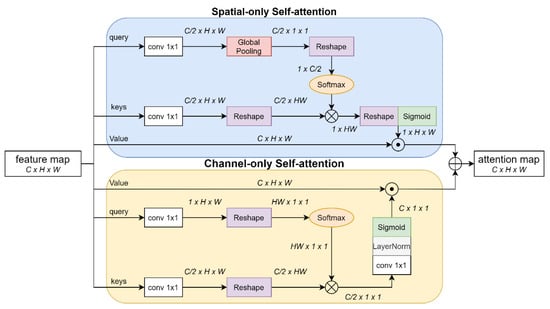 The PSA block can capture the long-range dependency and make features more discriminative on the feature maps, and is a very lightweight model that does not require excessive costs regarding memory and calculation, while keeping a high resolution in attention computation. As Figure 7 shows, the PSA contains two submodules: the channel-only self-attention module, and the spatial-only self-attention module.