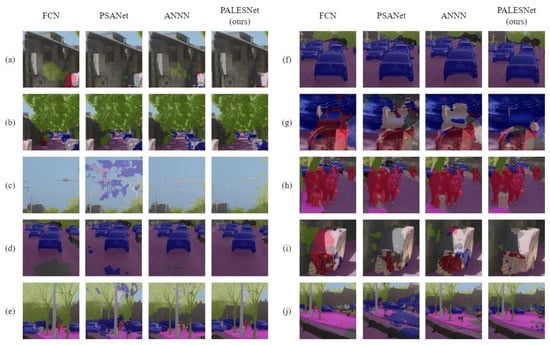 Apart from the qualitative analysis, we further investigated the segmentation results for each type of landscape feature. As shown in Table 4, we can observe that distinctive features which have a relatively larger area and unifying characteristics in the images (i.e., sky, road, vegetation, and building) had better segmentation results with all of the tested networks compared with the intricate categories, which are fragmentary and diverse (i.e., clutter, person, and pavements). Furthermore, PSANet and ANNN outperformed FCN on some intricate features such as clutter, which proves the potential of the attention mechanism. However, due to the extra complexity, the existing methods could not learn the feature representation with limited samples and this resulted in unsatisfied segmentation results for multiple categories. In contrast, our method achieved the best accuracy in most categories. For the distinctive features, all the models achieved similar results and our method achieved a slight advantage (outperforming by 2–3%). For intricate features, on the other hand, the proposed network outperformed the other methods by a large margin (around 7–10%). These results demonstrate the effectiveness of the PSA module, especially for the reorganization of intricate features.