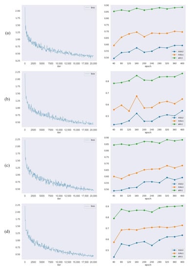 Loss and metrics curves for (a) FCN, (b) PSANet, (c) ANNN, and (d) PALESNet. It can be seen that compared to the original FCN, the attention-based methods could continually learn information from the training and resulted in the upward trend on all evaluation metrics. Moreover, the proposed PALESNet had a smoother convergence curve than PSANet and had a higher convergence speed compared to ANNN.