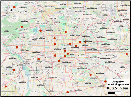 Figure 1. Scope of the study on real-time air quality estimation (covering all 22 air quality monitoring stations built in Beijing before 2013). The red dots indicate air Quality Monitoring Stations. - For meteorological monitoring data, the data span the time period from 28 February 2013 to 28 February 2014, with a time granularity of one hour. The data include information on temperature (°C), pressure (hPa), humidity (%), wind speed (km/h), wind direction (°), and description of weather conditions (rain, snow, clear, etc.). Temperature, pressure, humidity, and wind speed are calculated by hourly average values. Because the urban environmental protection department in the construction of air quality monitoring stations, will be equipped with meteorological characteristics monitoring equipment. Therefore, the meteorological Monitoring site is consistent with the air quality monitoring site.