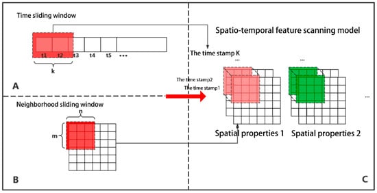 Spatio-temporal integration feature extraction model. (A) represents time feature extraction, (B) represents spatial features extraction, and (C) represents temporal and spatial features fusion. The red square in (A) represents the sliding window of time, the red square in (B) represents the sliding window of space. The pink and green squares in (C) represent sliding spatio-temporal windows for the two properties respectively.