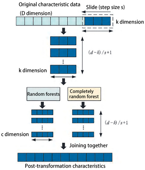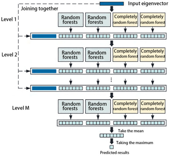 The multigrained cascade forest approach [41] is a machine learning method based on a random forest [42]. The most important feature of this method is that it can achieve adaptive model parameters without relying on human experience, the training difficulty is low, and it can effectively explore the sequential information of sequence data and the spatial correlation information of spatial data.