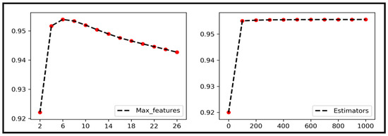 In the usual random forest model setting, assuming that the full set of attributes contains a total of s attributes, the default setting of m is generally s or . To better judge the relationship between this parameter and the training effect, we tested the relationship between the value of m and the accuracy several times. The test results are shown on the left of Figure 6, where the horizontal axis represents the maximum number of features m involved in the judgment when dividing attributes, and the vertical axis represents the fitting accuracy. From the test results, we can see that the fitting accuracy reaches the critical point when m is taken as six; therefore, we set this parameter as six.