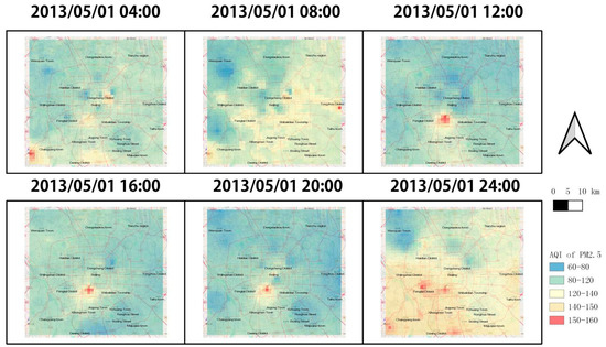 The PM2.5 estimation and the visualization of the results were carried out for all time periods (1:00 am to late at night at 12:00 pm) on the day of 1 May 2013 (shown in Figure 8). From the estimation results, we can see that the cascade forest-based real-time urban air quality estimation model with fine-temporal and spatial granularity proposed in this part of the experiment had a good estimation effect, and the visualization results had a smooth transition and could clearly show the air differences in microregions. From the estimation results of the day, it can be seen that the air quality was better in the afternoon to evening hours than in the early morning to morning hours, and the air pollution situation was consistent with the previous research findings, showing an intensive pollution pattern [17]. Severe pollution areas in the first half of the day period were mainly found in Chongwenmen, Xuanwumen, Haidian, Daxing, Yizhuang, Shijingshan, and other areas, while the air quality in the second half of the day period formed a peak pollution area in Fengtai District.