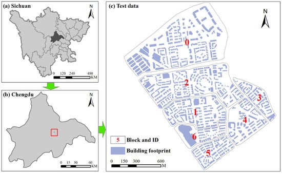 Our case study area is located in the Chinese city of Chengdu, which is the largest city in southwestern China (Figure 1). The study materials in our research consist of building footprints, road networks and real-time Tencent user density (RTUD). The building dataset and road networks were provided by the Province Urban Planning and Design Survey Research Institutes of Sichuan Province, China. This dataset includes 546 buildings in the ESRI shapefile. They are partitioned into several blocks by the road networks. These buildings are grouped into district units on electronic maps. RTUD data record the location information of smart terminal devices using Tencent products, including Tencent QQ, WeChat, Tencent Maps and other mobile applications that provide location-based services (LBS). A web crawler was developed to capture this data every two hours on the Tencent website (http:ur.tencent.com, accessed on 5 June 2020). Given that people generally have different activities on workdays and non-work days, we selected RTUD data on a workday (5 June 2020) and a non-work day (6 June 2020) in our study area to infer building functions. Additionally, we utilized Baidu Maps and Google Earth images to verify the experimental results. Road network data downloaded from AutoNavi map were used to discuss the generalization results. AutoNavi map is an electronic map that is widely used in daily life for driving navigation.