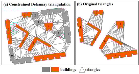 Step 4. To improve processing efficiency, the topographical map of buildings is partitioned into a series of building blocks by a road network. This is because every two buildings need to be compared to detect proximity relations during data processing. If the dataset is too large, traversing will take considerable time. Thus, each building block is an individual treatment unit in the subsequent processing. Then, two types of constrained Delaunay triangulations (CDT) are created for each individual block (Figure 2). The first type of CDT is computed for all buildings within each individual block (Figure 2a). Another type of CDT, namely, paired building triangles, is computed only for each pair of adjacent buildings (Figure 2b). The first type of CDT needs to be created first to detect adjacency relationships among buildings. If two buildings are adjacent, their paired building triangles are created. Before creating a CDT, it is better to add extra points on the line segments of building polygons and roads at an interval to avoid producing narrow triangles [].
