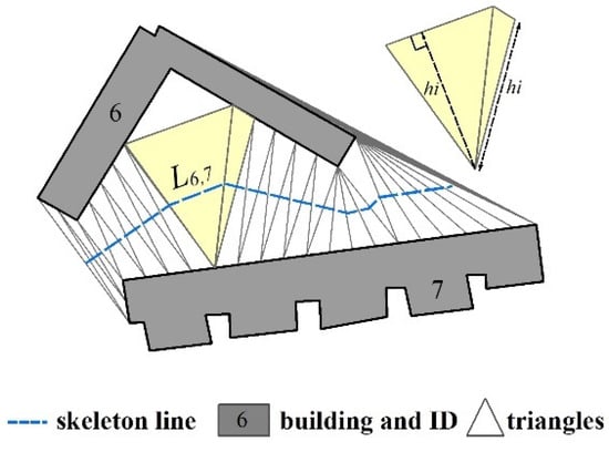 where denotes the distance between the two middle points of the sides of a triangle that link two adjacent buildings, denotes the sum length of the skeleton line between two adjacent buildings, and if two buildings and are not adjacent, as obtained in Equation (2).