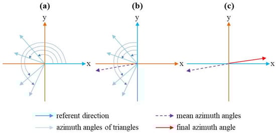 Example of calculating the azimuth angles of adjacent buildings are shown for (a) the azimuth angles of all triangles; (b) the mean azimuth angle of two adjacent buildings; (c) the final azimuth angle of two adjacent buildings.
