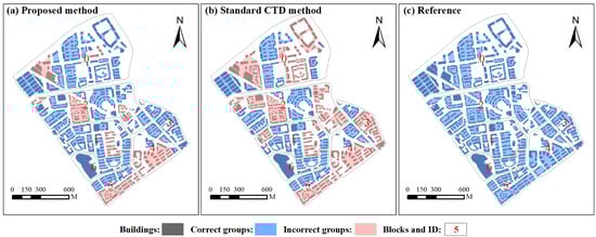 Building group recognition results are shown for (a) the proposed method, (b) the standard CTD method, and (c) the reference map. Buildings covered with blue hatched patterns were correctly grouped, whereas those inconsistent with the reference maps are covered with red hatched patterns.