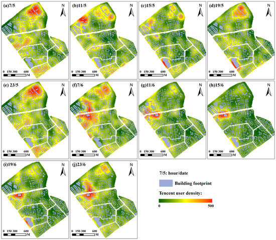 Figure 6 shows the mapping results of Tencent user density for different times in our study area. These mapping results indicate that the Tencent user density was significantly different over time. In other words, the space for people activities is different over time, especially on workdays and non-workdays. Thus, it is possible to infer building functions according to these changes.