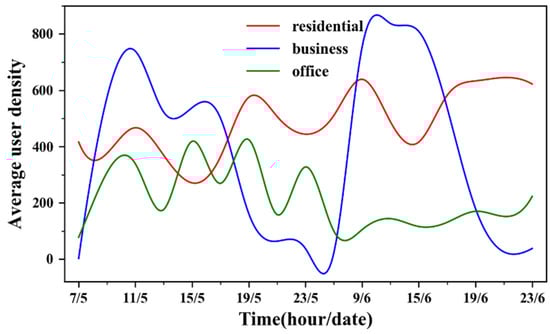 Figure 7 displays the temporal changes in the average Tencent user density in the study area over the two days. Clearly, obvious periodic oscillations occurred for the average user density curve of business buildings over the two days. There is almost no one in commercial buildings late at night. The temporal changes in average user density of residential buildings showed a slight difference between weekdays and rest days. Conversely, the average user density of office buildings varied considerably in the two days. This is because most people stay away from their workplaces on weekends.