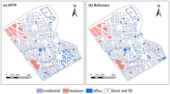 Results of building function recognition are shown for (a) DTW method, and (b) reference data.