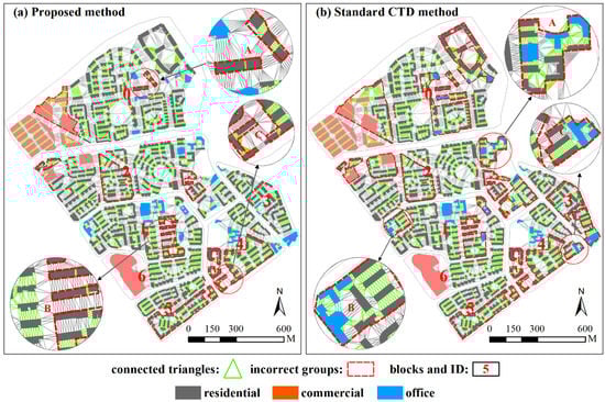 Returning to the grouping results in Figure 5, we find that the proposed method has a competitive performance for commercial building grouping, given that there is only one error group. In contrast, there are three incorrect groups recognized using the standard CTD method. For office building grouping, the grouping results of the proposed method are all correct, whereas the results recognized with the standard CTD method are all wrong. This approach mistakenly grouped office and residential buildings into the same groups. Neither method grouped the residential buildings identified as office buildings correctly.