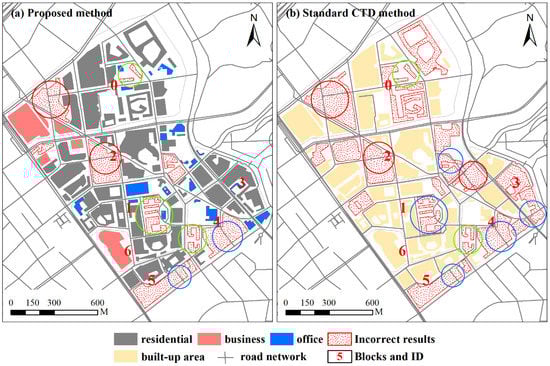 The generalized results based on building group patterns recognized using the two methods are shown for (a) the proposed method, and (b) the standard CTD method. Incorrect results marked with red circles were generalized from inclusion patterns. Incorrect results marked with green circles were generalized from the within patterns. Incorrect results marked with blue circles were generalized from overlap patterns.