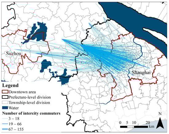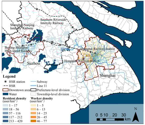 China is undergoing a similar process [21]. In the Yangtze River Delta region, one of the most developed regions in China in terms of transport infrastructure and economic development, intercity commuting has become a reality. In Shanghai, the advent of high-speed transport infrastructures such as the 350 km/h Shanghai–Nanjing Intercity Railway, Beijing–Shanghai High-speed Railway, Shanghai’s metro line 11 extending to Suzhou, and the highly-developed freeway network have made intercity commuting become a common phenomenon in Shanghai. The number of intercity commuters is rising, and the residential housing development has boomed along some HSR routes or transport corridors. From the perspective of spatial structure, a functional continuous area has gradually taken shape and exceeded the administrative boundary between Suzhou and Shanghai [22]. According to previous studies, long-distance commuting is empirically defined as commuting that takes more than 40 min [23] or covers a distance of over 30 km [24]. In a questionnaire survey conducted in 2018, the interviewed commuters travel from Suzhou to Shanghai by HSR with an average commuting time of 89.56 min and an average distance of over 80 km and, therefore, are typical long-distance commuters [25].