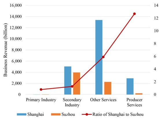 In this study, the workplace is the downtown area of Shanghai and the place of residence is the Suzhou administrative area (Figure 1). As the core city of the Yangtze River Delta region, Shanghai is a regional hub connecting flows of business, capital, population, and information [56]. With higher productivity, Shanghai is a more attractive workplace for commuters from surrounding cities. Its downtown area boasts the highest density of businesses and high-end jobs citywide. Intercity commuters who choose to work in downtown Shanghai, instead of in suburban Shanghai, are more likely for financial benefits and career development. Suzhou is the major city of residence for intercity commuters to Shanghai. Being adjacent to Shanghai, it is an important city in the Yangtze River Delta region. According to the official statistics for 2020, Shanghai’s GDP reached RMB 3870 billion yuan and its population 24.9 million, while Suzhou’s GDP was RMB 2017 billion yuan and its population 12.75 million. Although the GDP and per capita GDP between Suzhou and Shanghai does not appear very different, Shanghai is the unique center of advanced industrial agglomeration in the Yangtze River Delta region [57]. According to the 2020 Official Statistical Yearbook, the above-scale business revenue of Shanghai and Suzhou by industry type demonstrates a significant gap in industrial development between Shanghai and Suzhou (Figure 2). The development of producer services in Shanghai is much better than in Suzhou. In this paper, spatial units are defined based on the administrative boundaries of the township units in the two cities. The downtown area of Suzhou or Shanghai is the set of township-level units that intersect with the downtown area defined by the official master planning.
