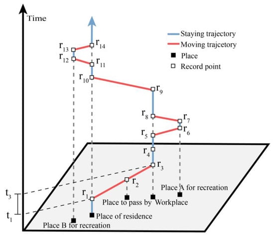 where stands for record point i; stand for the base station, record time, longitude, and latitude of record point i, respectively; n the total number of record points of the user in that given day. All record points are in chronological order. Figure 3 shows the typical daily spatial–temporal trajectory of a commuter. If two or more contiguous record points share the same base station, they are counted as one stop point. For example, in Figure 3 can be counted as one stop point. In Figure 3, the trajectory of a stop point is indicated as a blue line and the trajectory between two adjunct stop points as an orange line. For each mobile phone user, the overall duration of each stop point from 20:00 at night to 6:00 the next morning is calculated, and the stop point where the user stays for the longest time (and at least more than 1 h) is considered as the user’s place of residence on that given day. If no such stop point is found, the user will be identified as one with no place of residence on that day. Most people follow rather steady daily commuting patterns but may occasionally deviate from their usual routes. Therefore, the most frequently identified place of residence (identified as such for more than 50% of days in a month) is regarded as the user’s actual permanent place of residence.