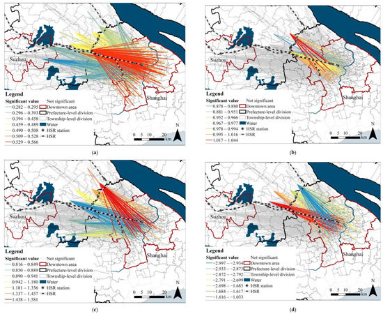 Industry determinants include the scale of producer services in workplace (Figure 5a) and scale of non-producer services in residence (Figure 5b). For most OD flows, the scale of producer services in workplace passed the significance test, and its influence is spatially extensive. We can see that the residence units of those OD flows are mostly near the boundary between Suzhou and Shanghai. The greater the distance between a residence unit and the boundary, the fewer OD flows pass the significance test in this unit. However, along the HSR line, even in the residence units far from the boundary, there is a considerable amount of OD flows whose scale of producer services in workplace passed the significance test. This means that HSR can make advanced jobs available and attractive even if the places of residence are very far from the workplace. In most spatial units in downtown Shanghai, there are OD flows whose scale of producer services in workplace passed the significance test, which means in terms of significance scope, the spatial nonstationarity of this determinant can hardly be observed in the workplace area. Although the scale of non-producer services in residence passed the significance test in the global regression model, its influence was rather limited: only a few OD flows starting from the residence units near the boundary to the west and central areas of downtown Shanghai passed the significance test.