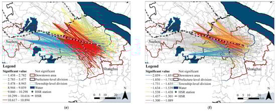 Residence determinants include housing supply in residence (Figure 5c), housing price in residence (Figure 5d), and year of construction in residence (Figure 5e). OD flows whose housing supply in residence and housing price in residence passed the significance test mostly start from the residence units near the boundary of Suzhou and Shanghai and arrive at the central and western areas of downtown Shanghai. For most OD flows, the year of construction in residence passed the significance test, and its influence is spatially extensive. We can see that the residence units of those OD flows are mostly near the boundary between Suzhou and Shanghai. The greater the distance between a residence unit and the boundary, the fewer OD flows pass the significance test in this unit. However, along the HSR line, even in the residence units far from the boundary, there is a considerable amount of OD flows whose year of construction in residence passed the significance test. This means that HSR can significantly reduce the travel time and make the loss of social network acceptable even if the places of residence are very far from the workplace. In most spatial units in downtown Shanghai, there are OD flows whose year of construction in residence passed the significance test, which means in terms of significance scope, the spatial nonstationarity of this determinant can hardly be observed in the workplace area.